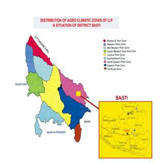 Basti District lies between 20.000 and 27.300 North latitude and between 80.150 and 83.800 longitude and 124 metre above the mean sea level. The major rivers of the district are Quano, Manwar, Aami and Ghaghra. Average annual rainfall of the district is 915 mm, out of which 68 percent falls during the month of July to August causing sporadic floods and water stagnation in low lying area. Occasional situations are continuous biting into the vitals of Rice-Wheat, Rice-Wheat-Sugarcane cropping system and there be affecting the economic status of farming community.